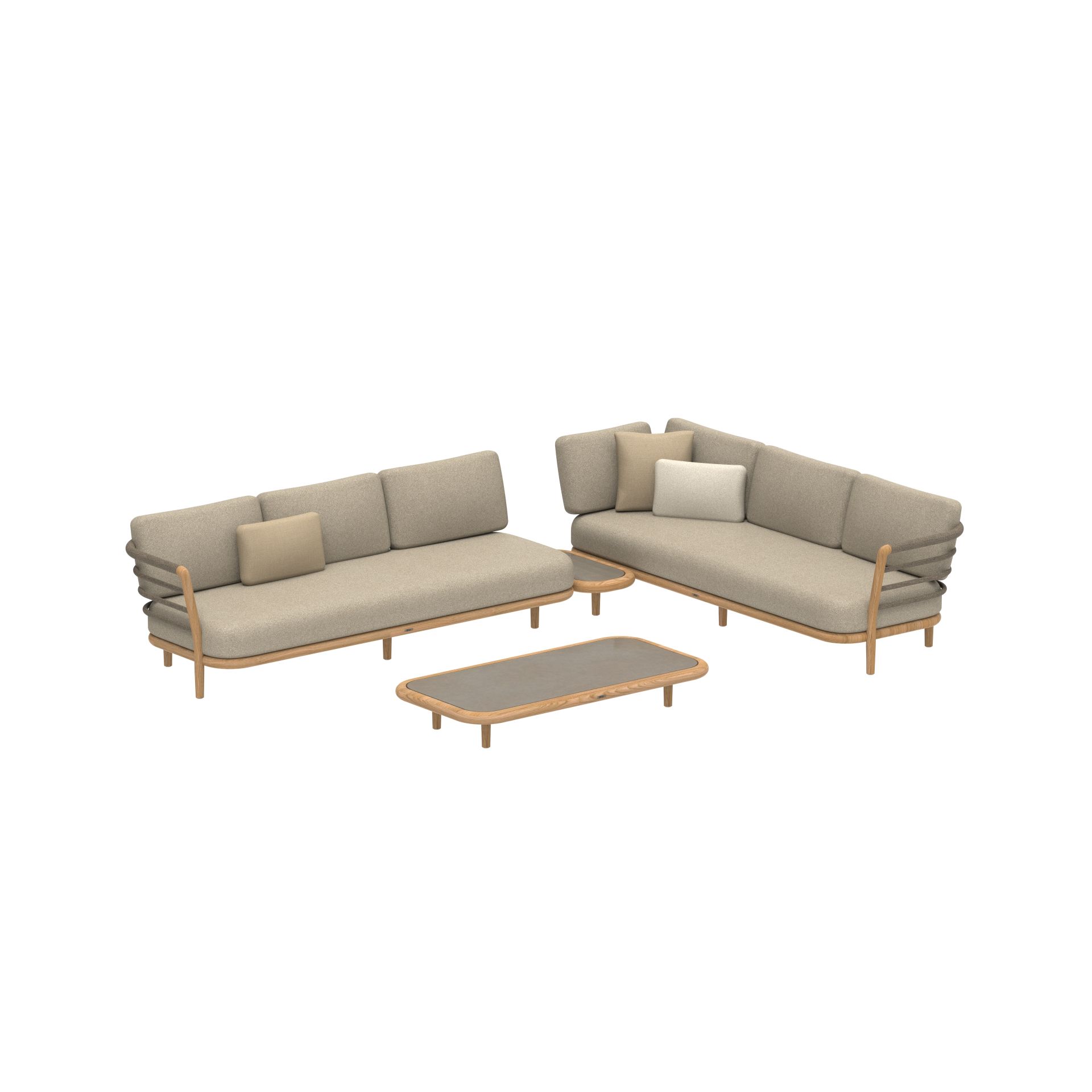 Das Set ist als komfortable Lounge-Komposition konzipiert und lässt sich flexibel platzieren – als großzügige Ecklösung oder als zwei harmonisch aufeinander abgestimmte Sofaelemente. Die tiefen Sitzflächen und die komfortablen Outdoor-Kissen machen Archy zum Mittelpunkt für entspannte Nachmittage und lange Abende im Freien.
