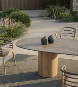 • Tischplatten je nach Ausführung in Teak, Keramik oder Glas