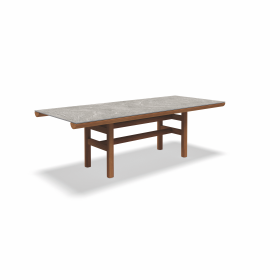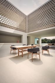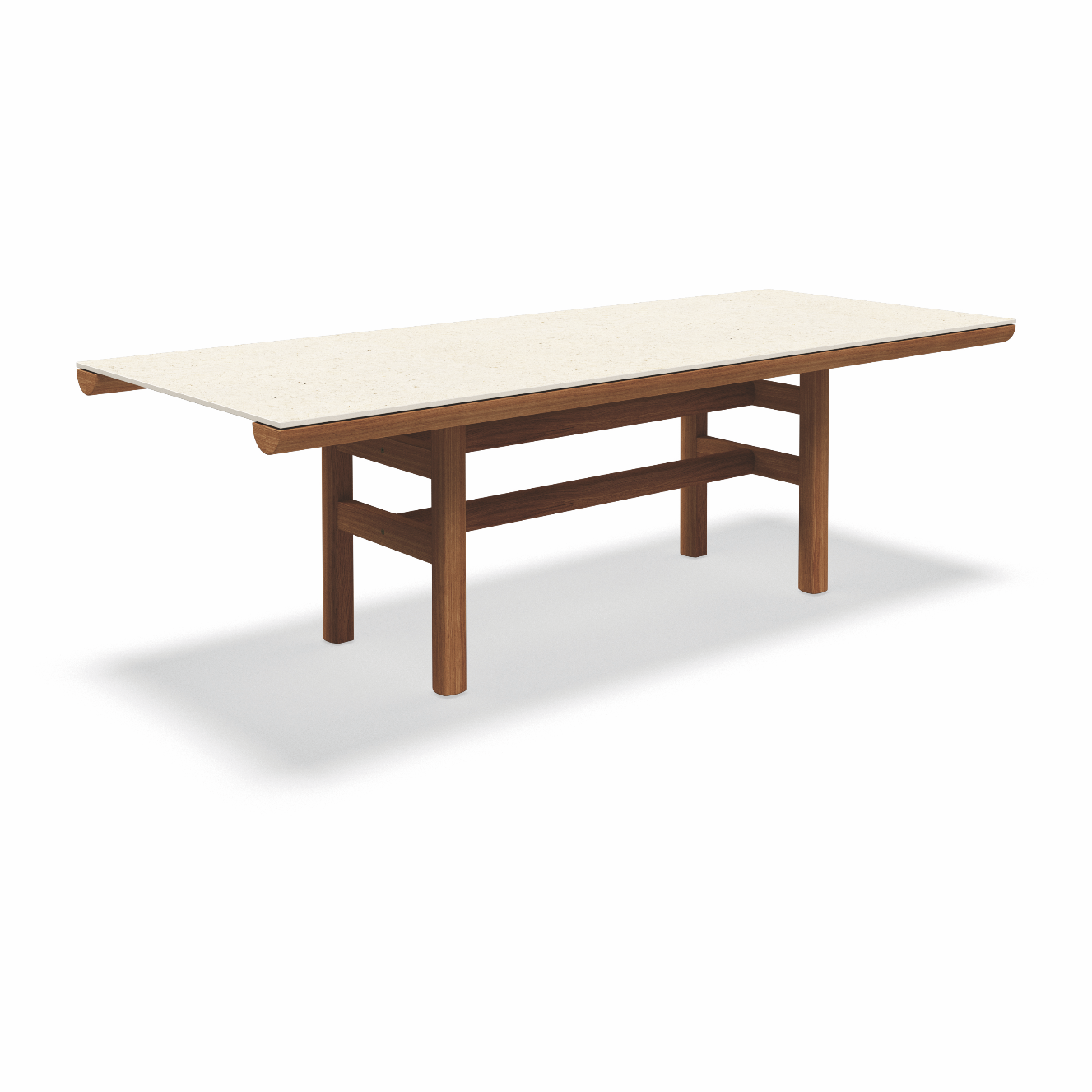 Die Rail Kollektion von Gloster steht für ruhige, präzise Outdoor-Architektur: Ein Rahmen aus naturbelassenem Teak trägt eine einteilige Keramik-Tischplatte und wirkt dabei bewusst reduziert, stabil und zeitlos. Rail ist als großzügiger Esstisch konzipiert – ein klarer Mittelpunkt für Terrasse, Garten und anspruchsvolle Hospitality-Settings.