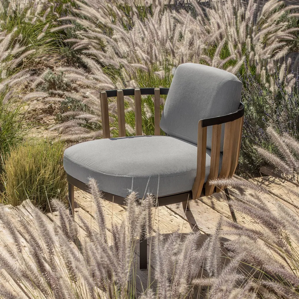 Die Frucht der Zusammenarbeit zwischen Patrick Norguet und Ethimo heißt Swing, eine Lounge-Kollektion mit doppelter Struktur: Eine äußere aus Metall, eine innere ausgebeizten Teakholzleisten, die wie ein Nest Körper und Geist aufnehmen.