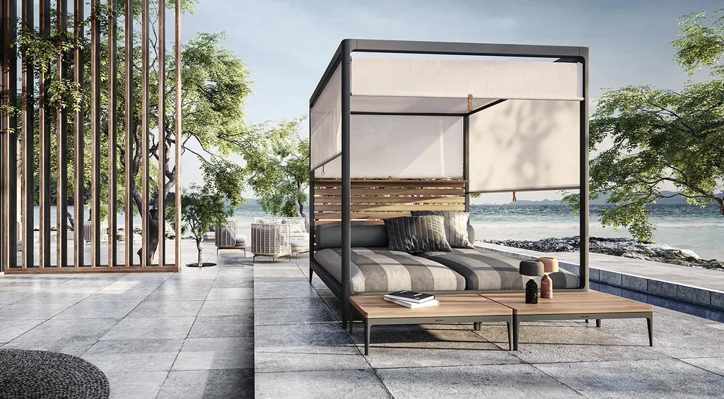 Gloster Grid Cabana Loungeliege | Teak-Rückenlehne und Sonnenschutzrollos