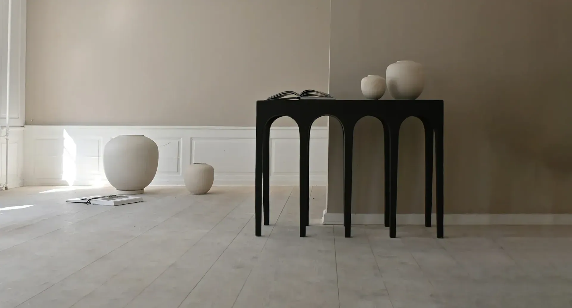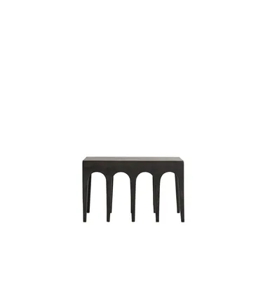 Ergänzend bringt die Serie mit Bow Console & Bench architektonische Referenzen in den Wohnraum: Die Wiederholung von Bögen erinnert an römische Aquädukte, wirkt trotz starker Präsenz schlank und leicht und wird aus leichtem Fiber Concrete mit texturierter, mehrfach handbemalter Oberfläche gefertigt.