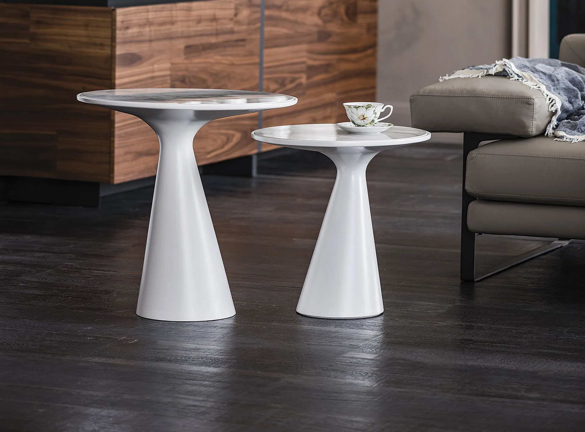 Die von Piero De Longhi entworfene Kollektion Cattelan Italia Peyote besticht durch die markante Form und die Vielseitigkeit der modernen Couchtische. Der geschwungene Sockel aus Polyurethan mit mattem Metallic-Finish setzt verspielte Akzente, während die elegante runde Glasplatte - wahlweise verspiegelt oder lackiert - den Tisch veredelt. Ob als ausgefallener Couchtisch neben der Sitzgruppe, in der Leseecke oder im Eingangsbereich. Besonders eindrucksvoll ist die Kombination der beiden Größen zu einem Set, spielen Sie gerne mit den verschiedenen Gestaltungsmöglichkeiten.
