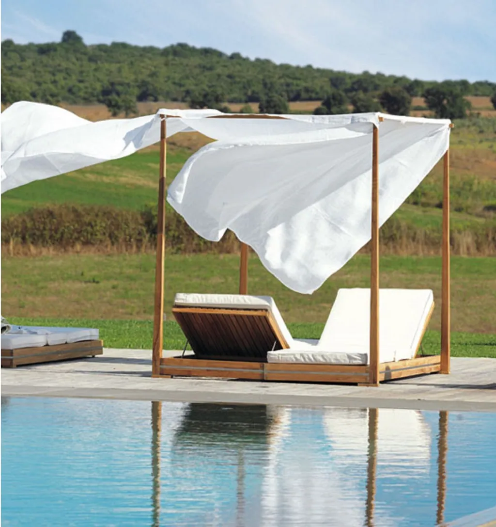 A teak lounge bed made up of two sunbeds with stainless steel insertions adjustable on both sides in four different positions, canopy and linen curtains.