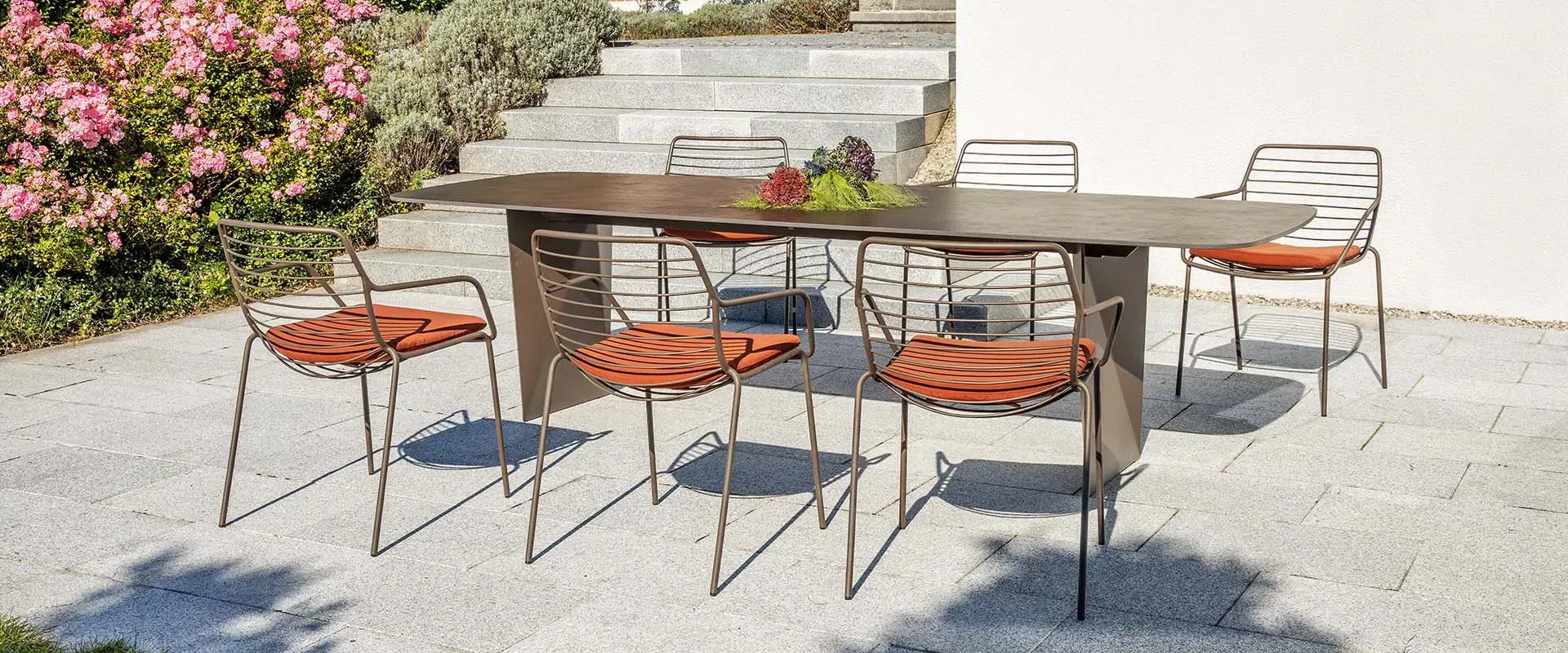 Leicht, stapelbar, und bequem. Zudem nur aus einem besonders wetterfesten und pflegefreien Material hergestellt: Edelstahl, pulverbeschichtet in dark bronze oder anthrazit. Ein Sessel der durch seine transparente Form sich nicht aufdrängt sondern elegant sich im Außenbereich einfügt. Eine ideale Kombination stellt der neue Claris Säulentisch, ein besonderes Highlight für den Außenbereich. Für große Terrassen empfehlen wir den Tierra Tisch. Für Bequemlichkeit sorgen die gesteppten Auflagen für Sitz oder Sitz-Rücken.