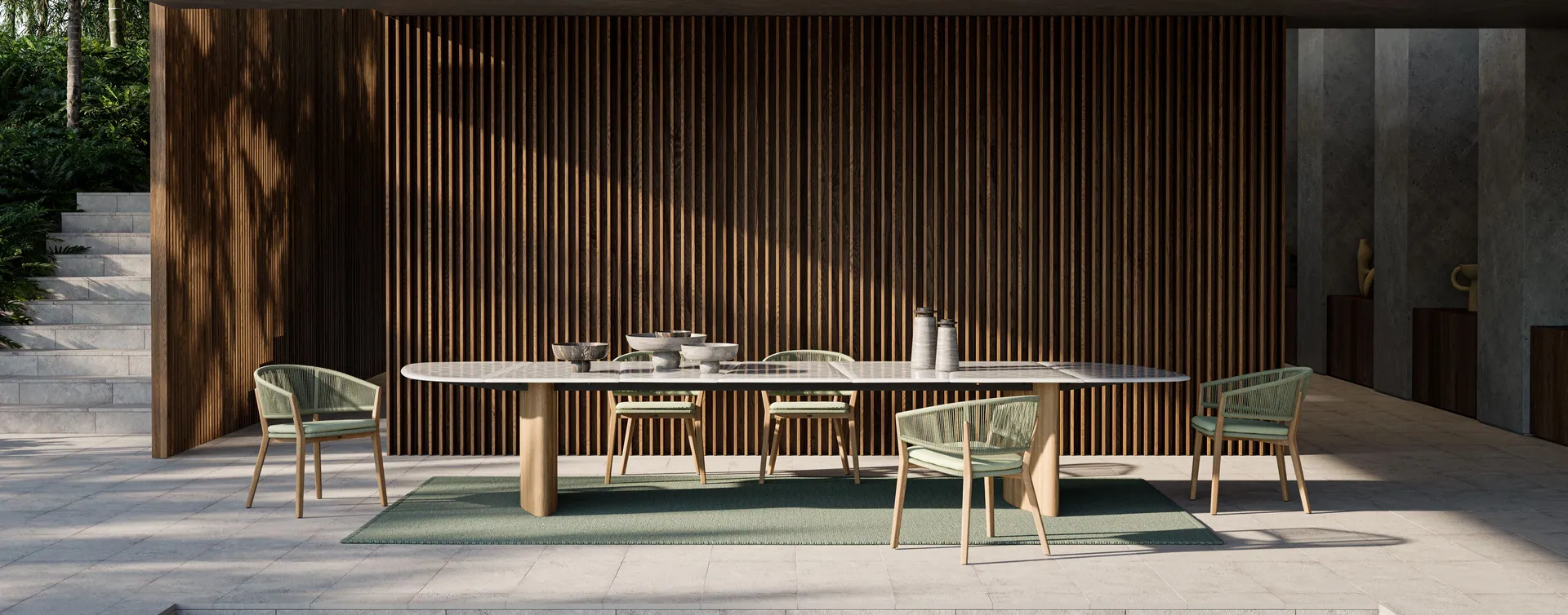 Die Carés Kollektion von Royal Botania (Design: Kris Van Puyvelde) verbindet funktionale Alltagstauglichkeit mit spürbarer Raffinesse: Ein Rahmen aus Premium-Teak bringt warme Ausstrahlung und Stabilität, während die Rückenpartie mit wasserresistenten, gedrehten Batyline-Fasern umwickelt ist. Das klassische Kreuzgeflecht der Sitzfläche erhöht dabei sowohl Komfort als auch Langlebigkeit.