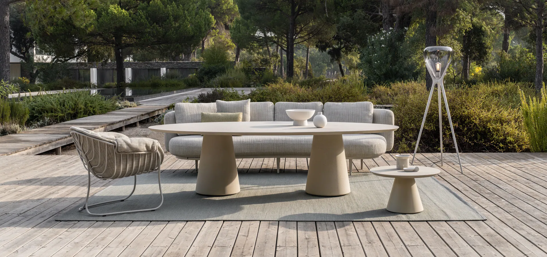 Die Conix Kollektion von Royal Botania steht für architektonische Klarheit und Material-Innovation: markante, konische Basen aus faserverstärktem Ductal®-Beton treffen auf edle Tischplatten – je nach Ausführung aus Keramik, Teak oder Beton. Die Basen sind in zwei Tonwelten erhältlich: Desert Beige oder Industrial Grey – für moderne Outdoor-Settings mit souveräner Präsenz.