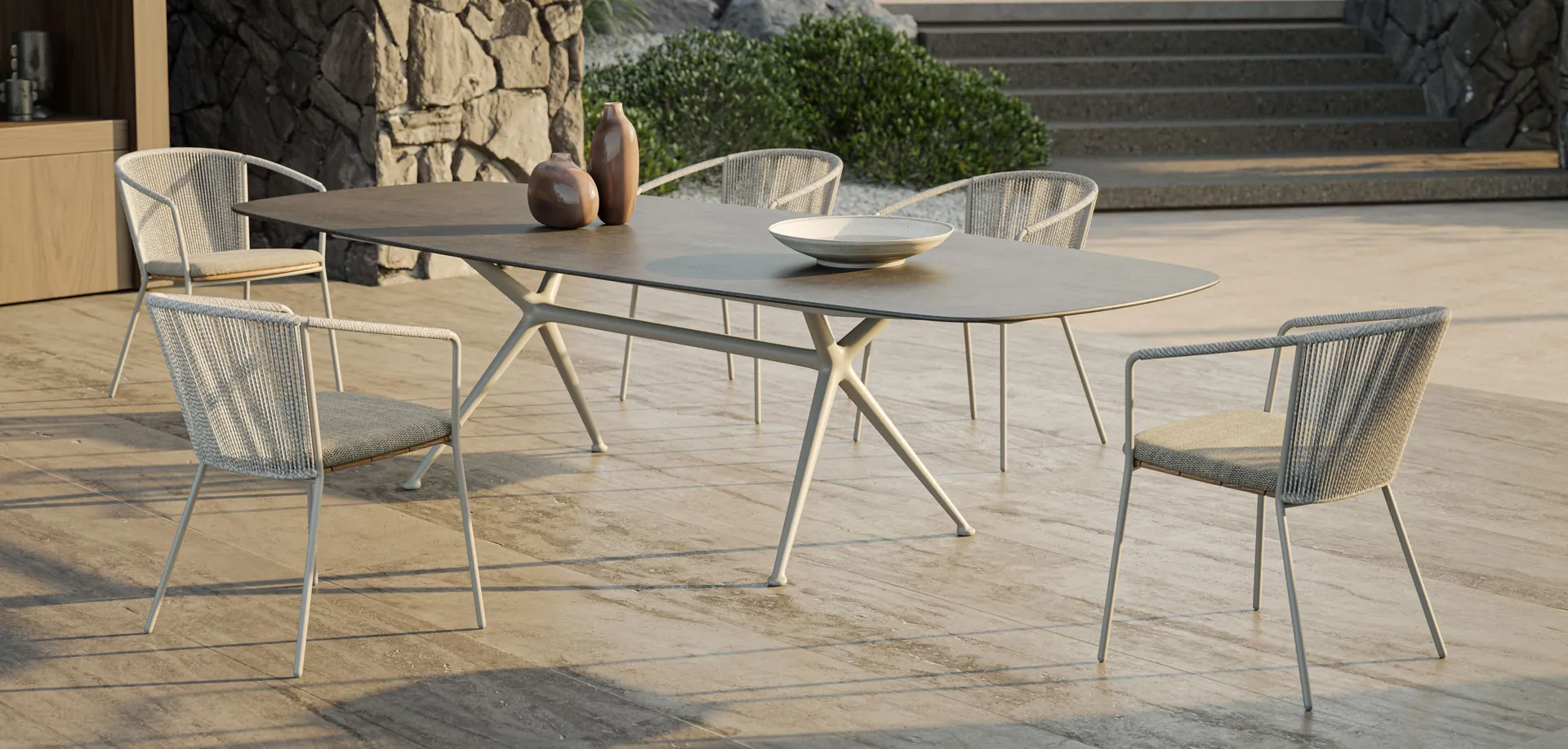 Die Cordiz Kollektion von Royal Botania bringt eine spürbare Leichtigkeit ins Outdoor-Living: schlanke Aluminiumbeine tragen eine massive Teak-Sitzfläche, während feine Kordeln in der Rückenlehne ruhige, geometrische Linien zeichnen. Das Ergebnis wirkt offen, modern – und bleibt Saison für Saison mühelos schön.
