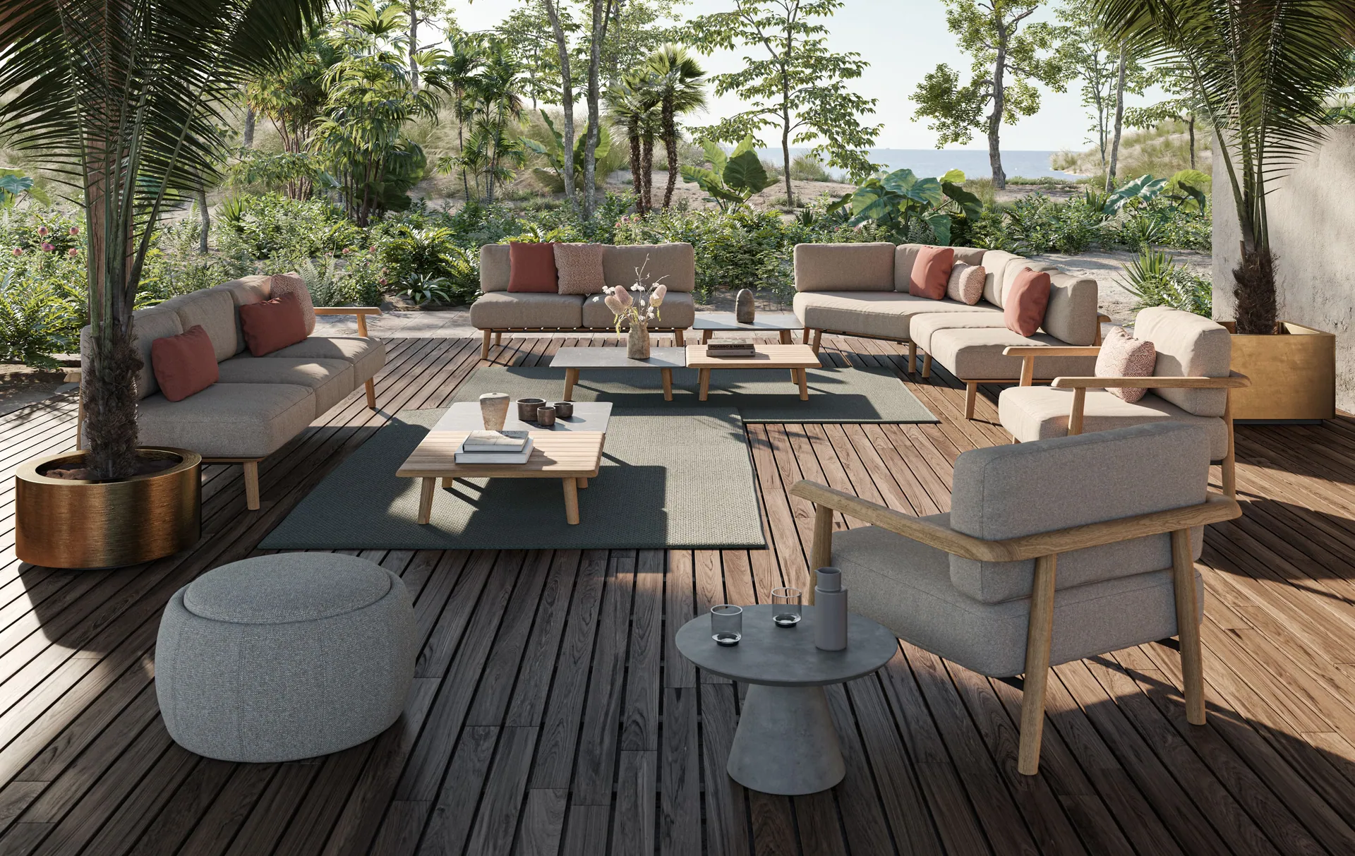 Die Mambo Kollektion von Royal Botania (Design: Kris Van Puyvelde) verbindet warme Teak-Konturen mit üppigen, luxuriösen Kissen – für ein Outdoor-Feeling, das die harten Kanten des Alltags weichzeichnet. Die Lounge-Elemente wirken einladend und wohnlich, getragen von einem verdeckten Stahlrahmen für Stabilität und Langlebigkeit.