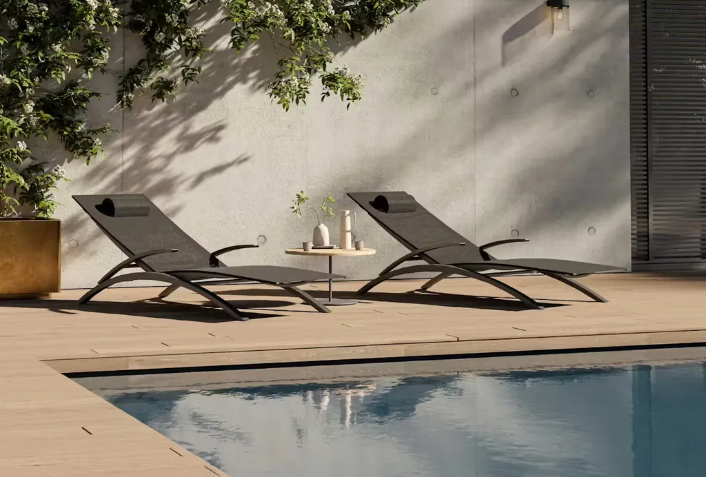 Für entspanntes Sonnenbaden ergänzt die Serie die O-ZON Sun Lounger – mit Batyline-Bespannung und optionalen Sitz-/Rückenkissen (z. B. Bouclé), inklusive Kopfkissen.