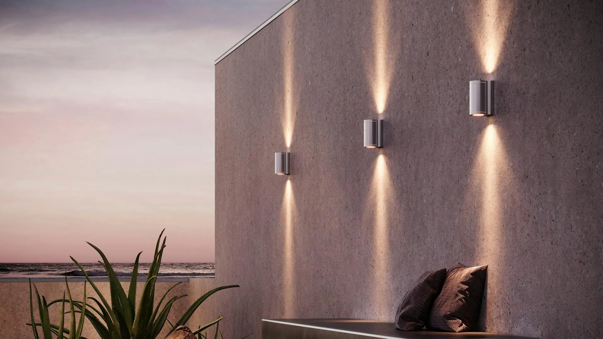 Die Omega Kollektion von Royal Botania sind puristische Outdoor-Wandleuchten aus Edelstahl, erhältlich als Down Lighter oder Up & Down Lighter. Ihr zylindrischer Körper setzt eine ruhige, moderne Silhouette – und zeichnet mit dem Licht ein präzises, architektonisches Bild an die Fassade.