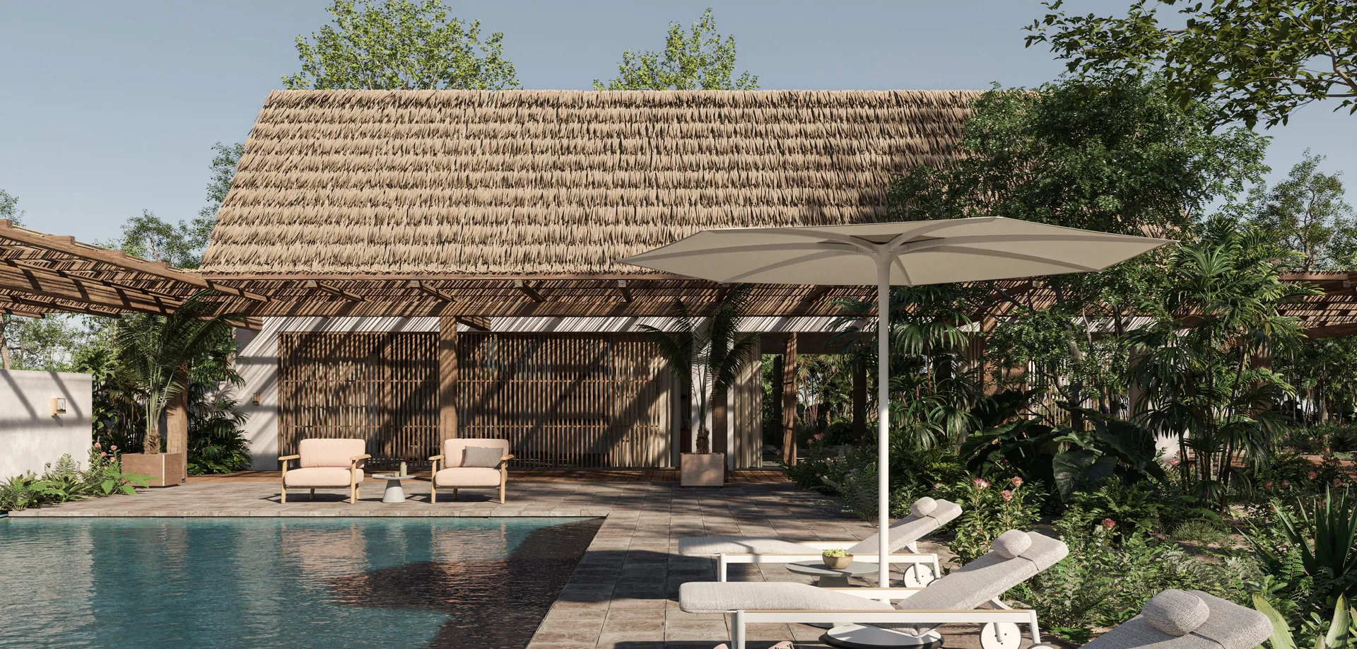 Palma von Royal Botania macht Schatten so mühelos wie nie: ein patentiertes, automatisches Öffnungs-/Schließsystem ohne Kurbel, Seile oder sichtbare Stützen – reduziert im Look, luxuriös in der Technik.