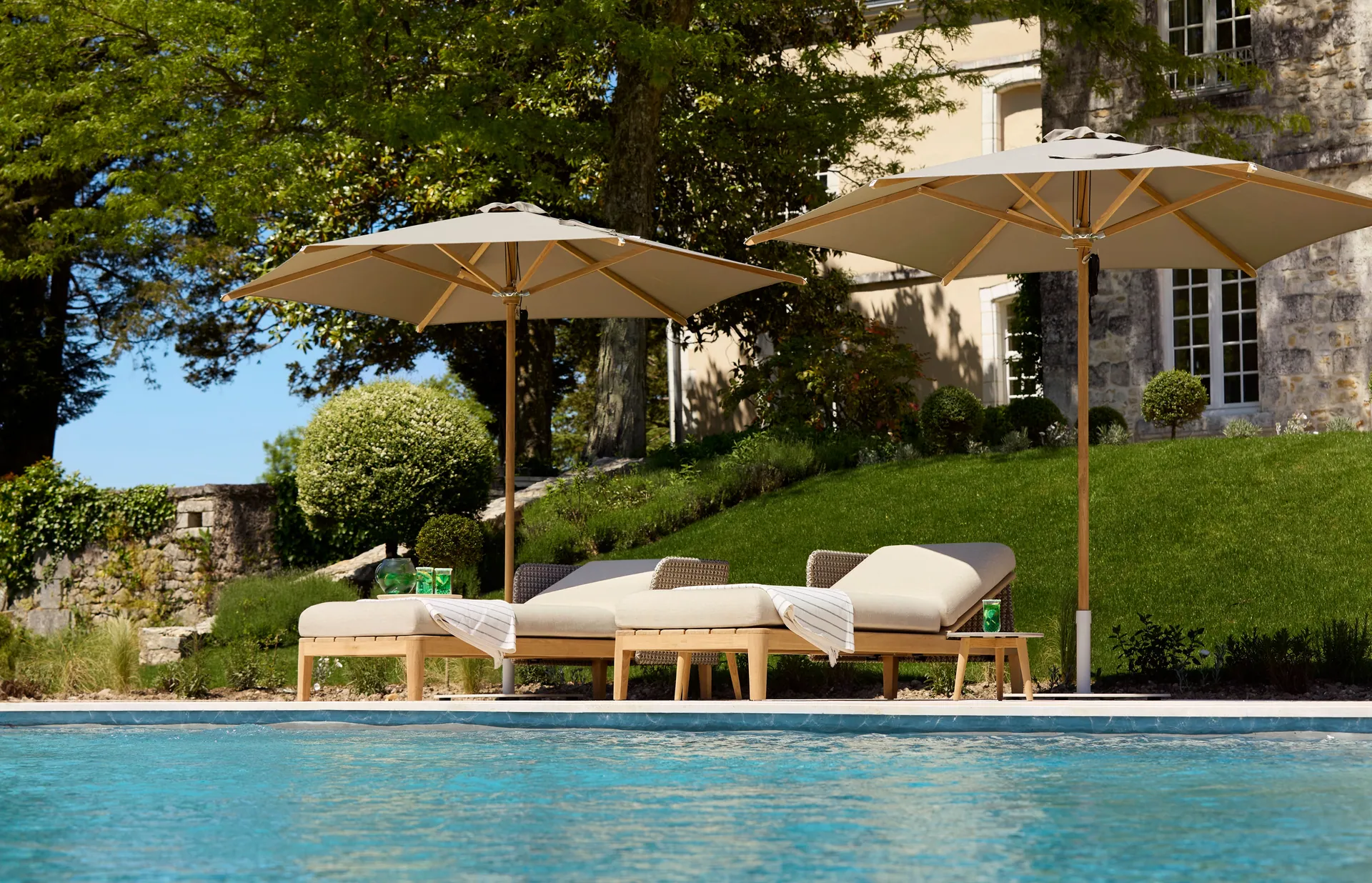 Die Shady Kollektion von Royal Botania erhebt den Sonnenschirm zum architektonischen Objekt: ein fein ausgearbeitetes Gestell mit präzisionsgefertigten Edelstahl-Beschlägen, Teakholz-Speichen und einem hochwertigen Acryl-Schirmdach für stilvollen, langlebigen Sonnenschutz.