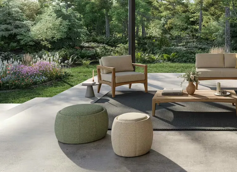 Die Tono Kollektion von Royal Botania denkt den Outdoor-Pouf neu: Eine starre, wasserresistente Struktur trifft auf abnehmbare Polsterung (per Klett befestigt), die schnell trocknet – und innen wartet zusätzlicher Stauraum für alles, was man draußen gern griffbereit hat. Erhältlich als Tono 50 und Tono 70, perfekt als Fußablage, Zusatzsitz oder flexibler Begleiter in Lounge- und Poolbereichen.