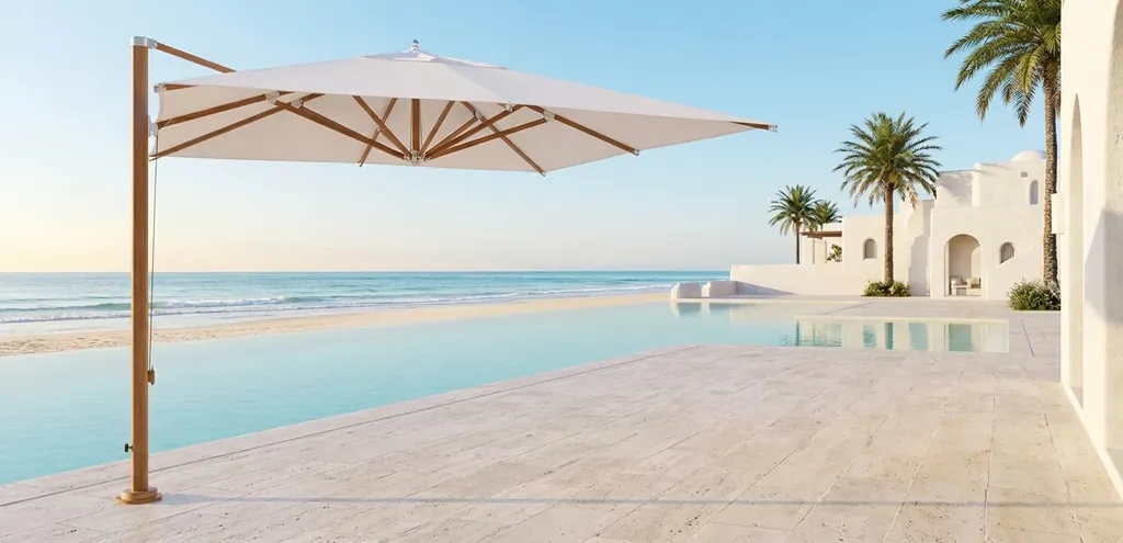Wer träumt nicht davon, einmal über den Dingen zu schweben? Welch erhabenes Gefühl muss man dabei haben? Nun, ein wenig kann davon dieser Cantilever von Tuuci berichten, denn er scheint tatsächlich über den Dingen zu schweben. Dank der raffinierten Konstruktion liegt er geschmeidig in der angenehmen Sommerluft. Versetzen Sie sich in Gedanken unter diesen wundervollen Schirm, der sanft wie ein Vogel über Ihnen zu schweben scheint, während Sie im Schatten entspannen. Der Cantilever lädt durch seine scheinbare Leichtigkeit dazu ein, den eigenen Gedanken freien Lauf und die Seele baumeln zu lassen. Werfen Sie hier bei der Villa Schmidt einen Blick auf diesen außergewöhnlichen Design-Sonnenschirm, bei dem nicht nur das Design, sondern auch die verwendeten Materialien vollends überzeugen. Sei es der elegante polierte Aluminium-Mast oder der wunderbare Stoff, der Tuuci Tuff-Skin, bei dem Sie sich unter einer Vielzahl von Farben für die Ihrige entscheiden können. Die Villa Schmidt bietet Ihnen diesen exklusiven Schirm aus gutem Hause hier in verschiedenen Größen an. Echte Größe beweist auch der Schatten, den der Cantilever erschafft. Dadurch, dass sich der Mast an der Seite des Schirmes befindet, können Sie den Schattenplatz perfekt nutzen, ohne ständig ein Hindernis im Weg zu haben. Ein Tisch mit Stühlen findet hier problemlos Platz, genauso wie eine gemütliche Sitzecke mit Tisch. Der Cantilever setzt Ihnen keine Grenzen. Sprengen Sie doch einfach die Entscheidungsgrenzen in Ihrem Kopf und machen Sie diesen Schirm zu Ihrem persönlichen Sommerbegleiter. Ihre Freunde, Bekannten und Gäste werden begeistert sein und Sie persönlich werden förmlich durch den Sommer schweben. Bei weiteren Fragen zu unserem hochwertigen Sonnenschirm-Programmen können Sie uns gern telefonisch kontaktieren. Kompetente und freundliche Mitarbeiter der Villa Schmidt kümmern sich gern um Sie.