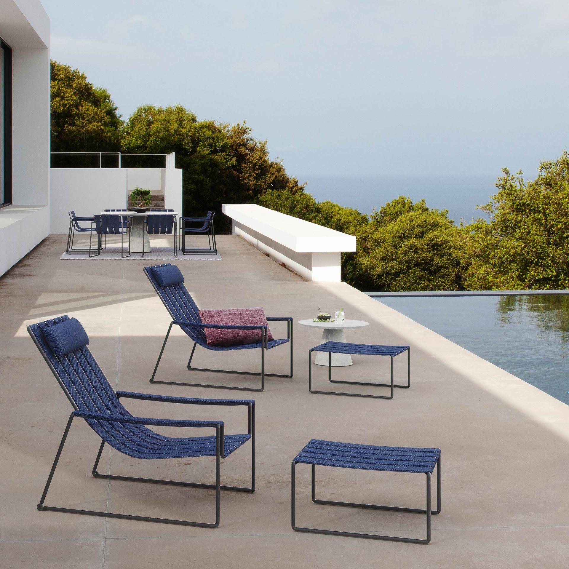Originell und modern ist die neue Strappy-Kollektion von Royal Botania. Die Stühle verfügen über eine beschichtete Edelstahlstruktur, die aus einer einzigen, durchgehenden Stange besteht. So wird ein beständiger, funktionaler Rahmen gebildet, an dem die Sitzgurte und Armlehnen befestigt sind. Gut verdeckt von der Polsterung sind die Aluminiumbänder, die Rücken- und Sitzfläche bilden. DIe Polster können zum Waschen oder verstauen der Sitzmöbel leicht abgenommen werden. Auch das Austauschen der Bepolsterung ist somit kein Problem.